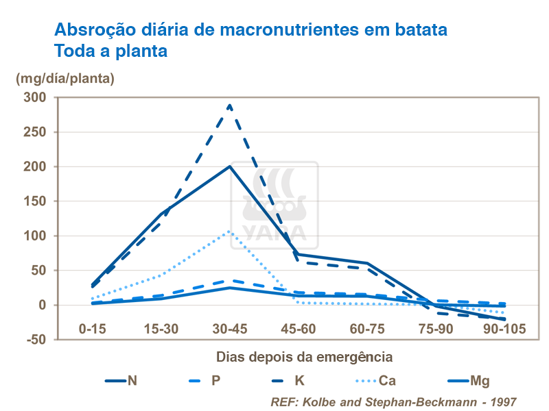 A absorção de nutrientes varia com a fase de desenvolvimento do cultivo. Existe uma solicitação grande de macronutrientes durante o desenvolvimento precoce da planta, e para que o crescimento fique limitado, é importante que se encontrem nutrientes disponíveis em quantidades suficientes para poderem ser absorvidos pela planta. Tanto o potássio como o azoto são necessários durante o crescimento vegetativo, a formação dos tubérculos e o enchimento dos mesmos.